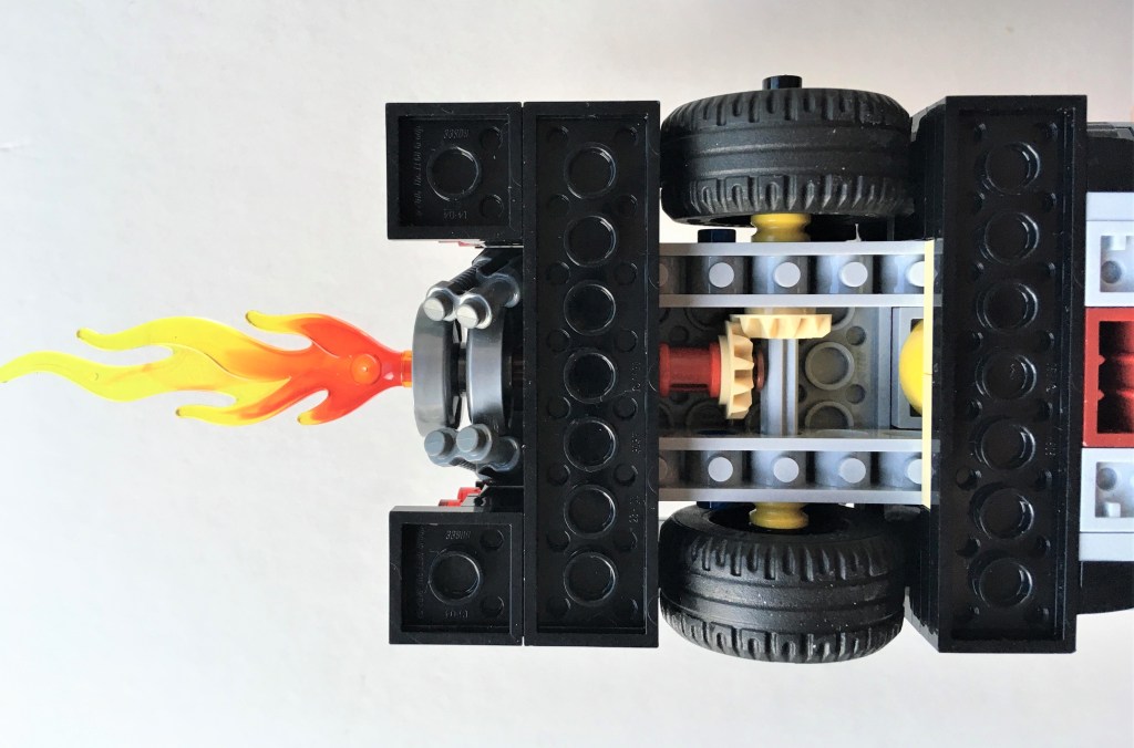 This amber-yellow flame is connected to the rear wheels, so when the car moves back or forth, the flame appears to be moving by itself.
