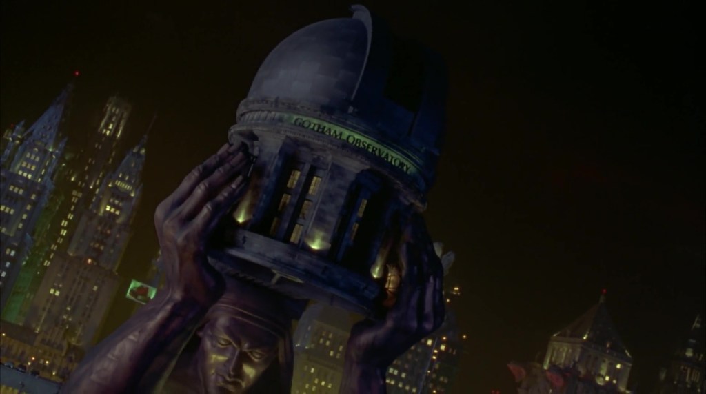 In the movie, Poison Ivy and Mr. Freeze formulate a plan to bring a permanent winter to Gotham City. Utilising a telescope at the Gotham Observatory, combined with Freeze’s Freeze Engine, the pair want to flash-freeze the city and turn every citizen into an ice sculpture.