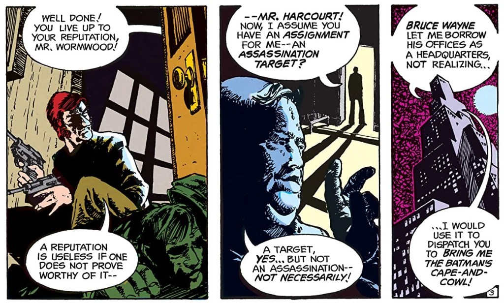 Wormwood reveals the name of the client, thus also confirming he was the assassin. It is at this point that Harcourt reveals his true identity, as Batman!